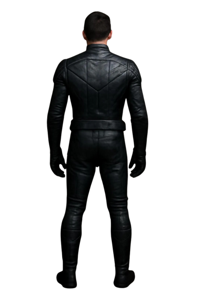 Step into the future with this custom-designed black leather armored bodysuit. Created for a bold and striking look, this full-body suit features sleek, angular paneling and padded rib details that add both style and durability.