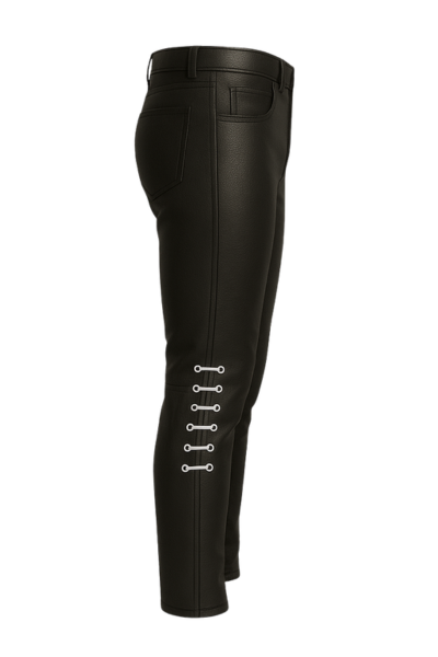 Step into bold style with these black leather pants made from real leather. They are handcrafted to provide comfort, flexibility, and a confident look. The white lace-up detailing on the sides gives a modern touch inspired by biker and gothic fashion.
