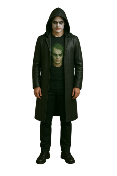 Transform into Gotham’s most iconic villain with this Joker-inspired leather costume. The full outfit includes a leather shirt, pant, and hooded coat designed in dark tones with a bold Joker face print for a striking statement.