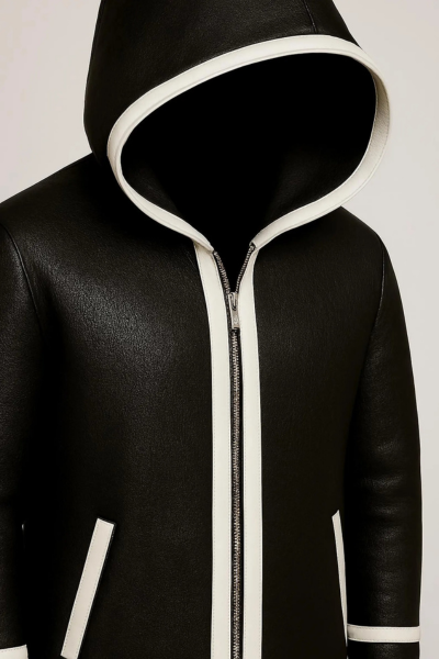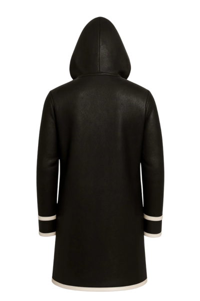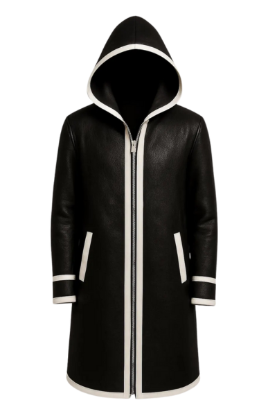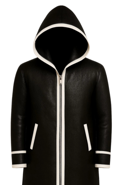 Bring bold style and premium craftsmanship to your wardrobe with this handmade real leather hooded long coat. Designed in rich black genuine leather with elegant white contrast trim, this coat offers a sleek modern look that stands out effortlessly.