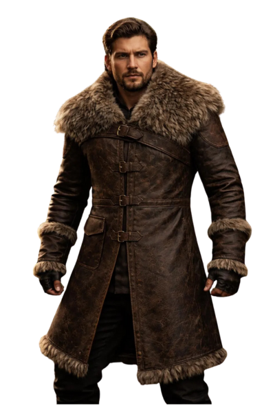 Get a strong warrior look with this men’s long leather coat made from 100% real leather. It features a bold faux fur collar and cuffs, inspired by Viking and medieval warrior styles. This coat gives a rugged, masculine look and is perfect for winter wear or costume use.