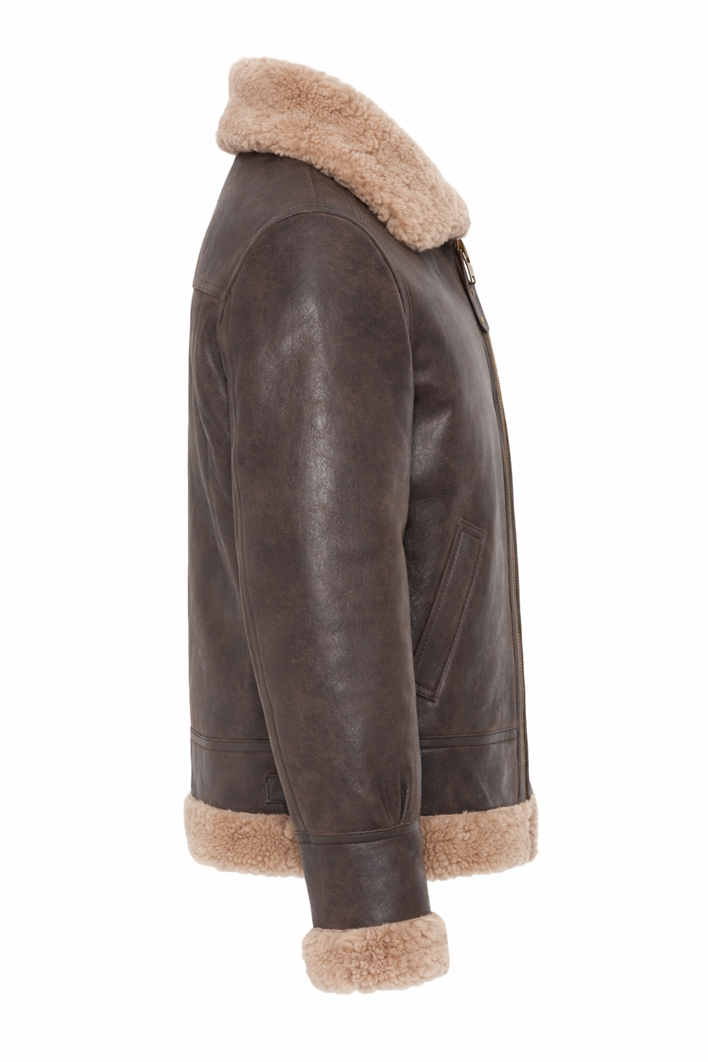 The rich dark brown leather exterior is perfectly complemented by the contrast shearling collar, cuffs, and hem, offering both insulation and a bold winter aesthetic. Designed with a front zip closure and angled side pockets, this jacket combines practicality with classic craftsmanship.