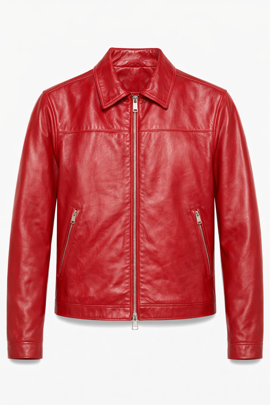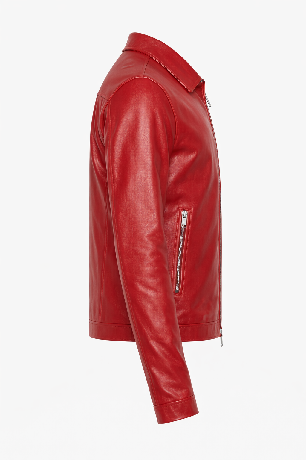 The rich red leather color adds a striking yet classy appeal, making it perfect for casual outings, evening wear, and smart-casual looks. Two vertical zippered side pockets provide practicality while maintaining the jacket’s sleek silhouette. Its tailored fit enhances comfort and style without feeling bulky.