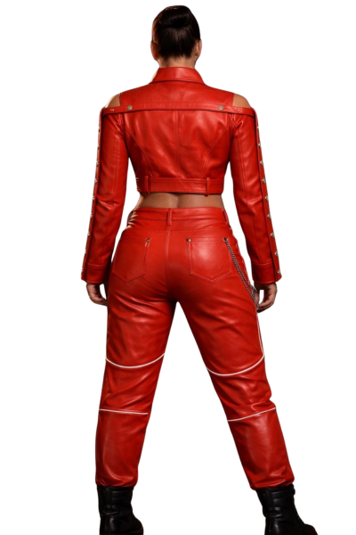 Make a bold and stylish look this Valentine’s Day with this red leather outfit. Made from 100% real leather, this set includes a cropped jacket with shoulder cut-out details and metal buttons, along with high-waisted pants that have white piping and a side chain for extra style.