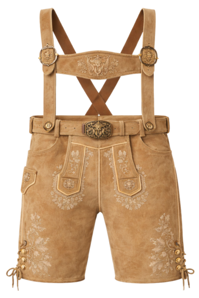 Premium real leather Oktoberfest shorts in tan beige color, featuring classic suspenders. Perfect for festivals, Bavarian events, and traditional German outfits.