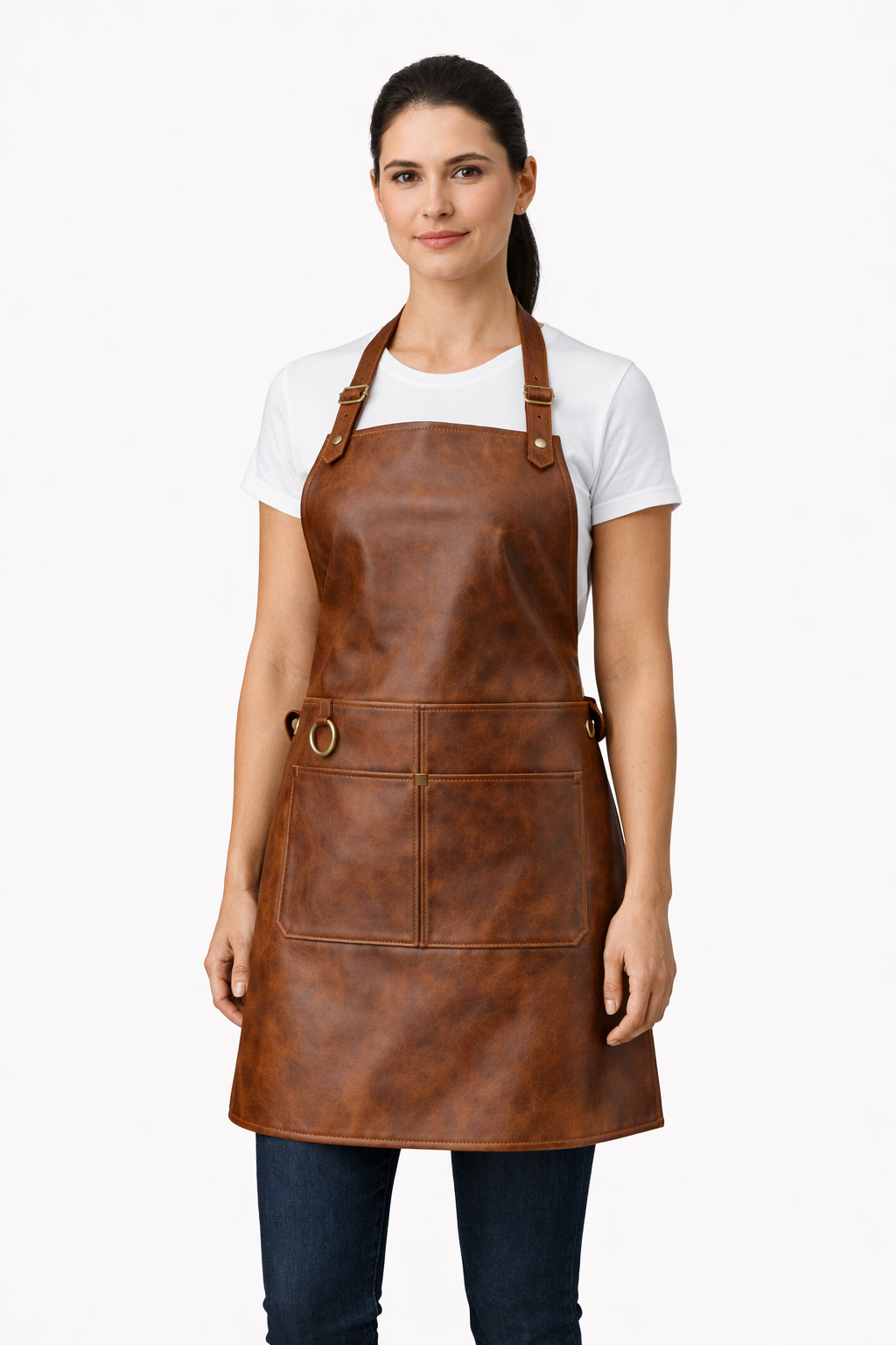 Premium women’s kitchen apron made from 100% real brown leather, featuring an adjustable fit and functional front pocket—durable, stylish, and perfect for everyday cooking.