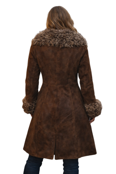 Designed for women who want both comfort and sophistication, this brown suede coat is a winter essential. Its tailored silhouette flatters the figure, while the soft faux fur trim adds a luxurious touch.